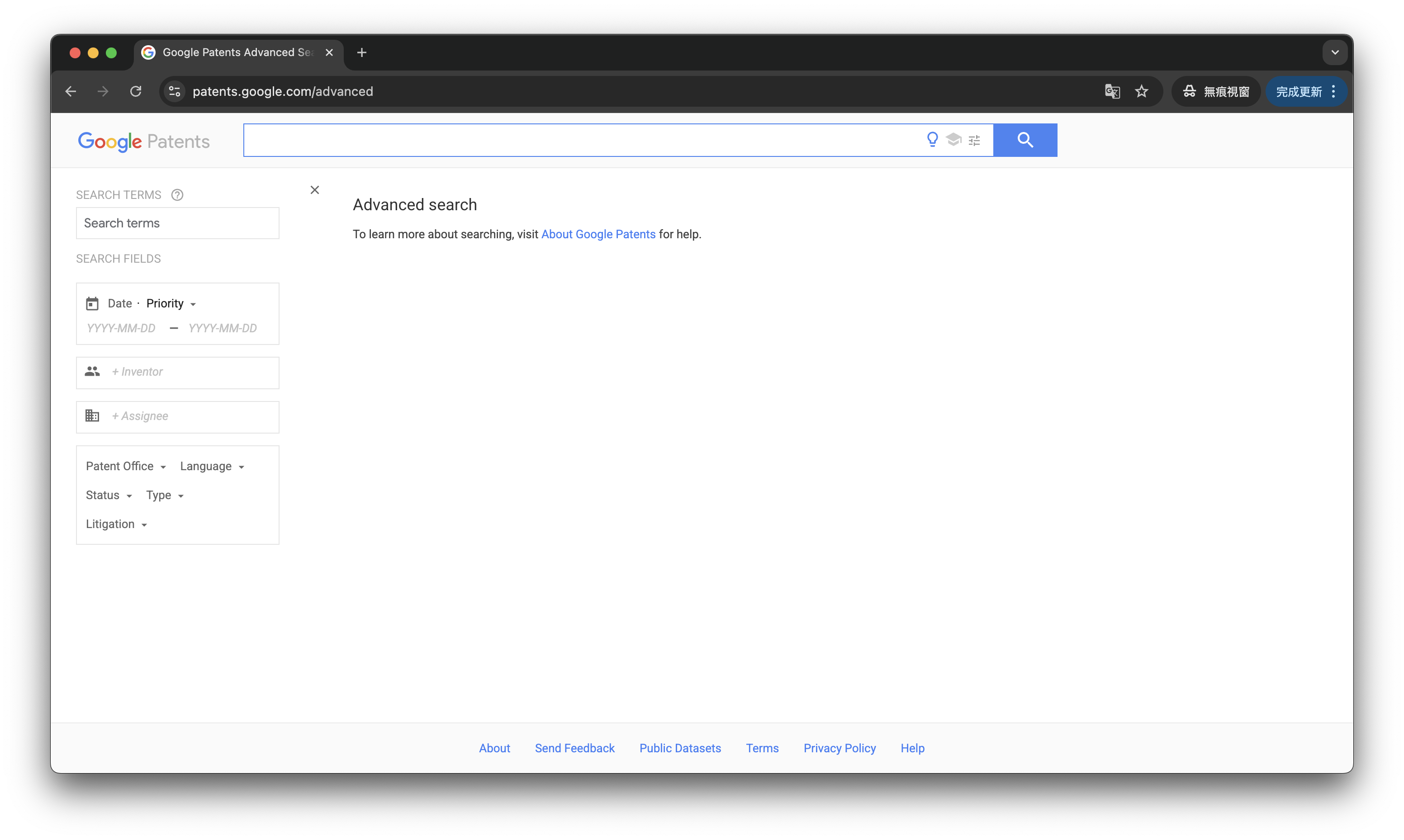 我通常都會建議初學者使用進階的介面,主要原因在於Google跟大部分的專利檢索網站一樣,都是透過檢索語法後從中篩選出相關的專利,進階的介面列出許多欄位,可以幫助初學者進行操作與輸入,比起乾淨介面來說更容易使用。